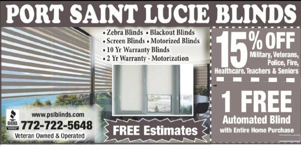 PSL Blinds has been providing high-quality shades and blinds to customers across South FL. Our goal is to provide beautiful and functional window treatments that will enhance the look and feel of any room in your home. Veteran Owned and Operated. BBB Accredited. We do Mobile Estimates! No Overhead! No Showroom saves you money!